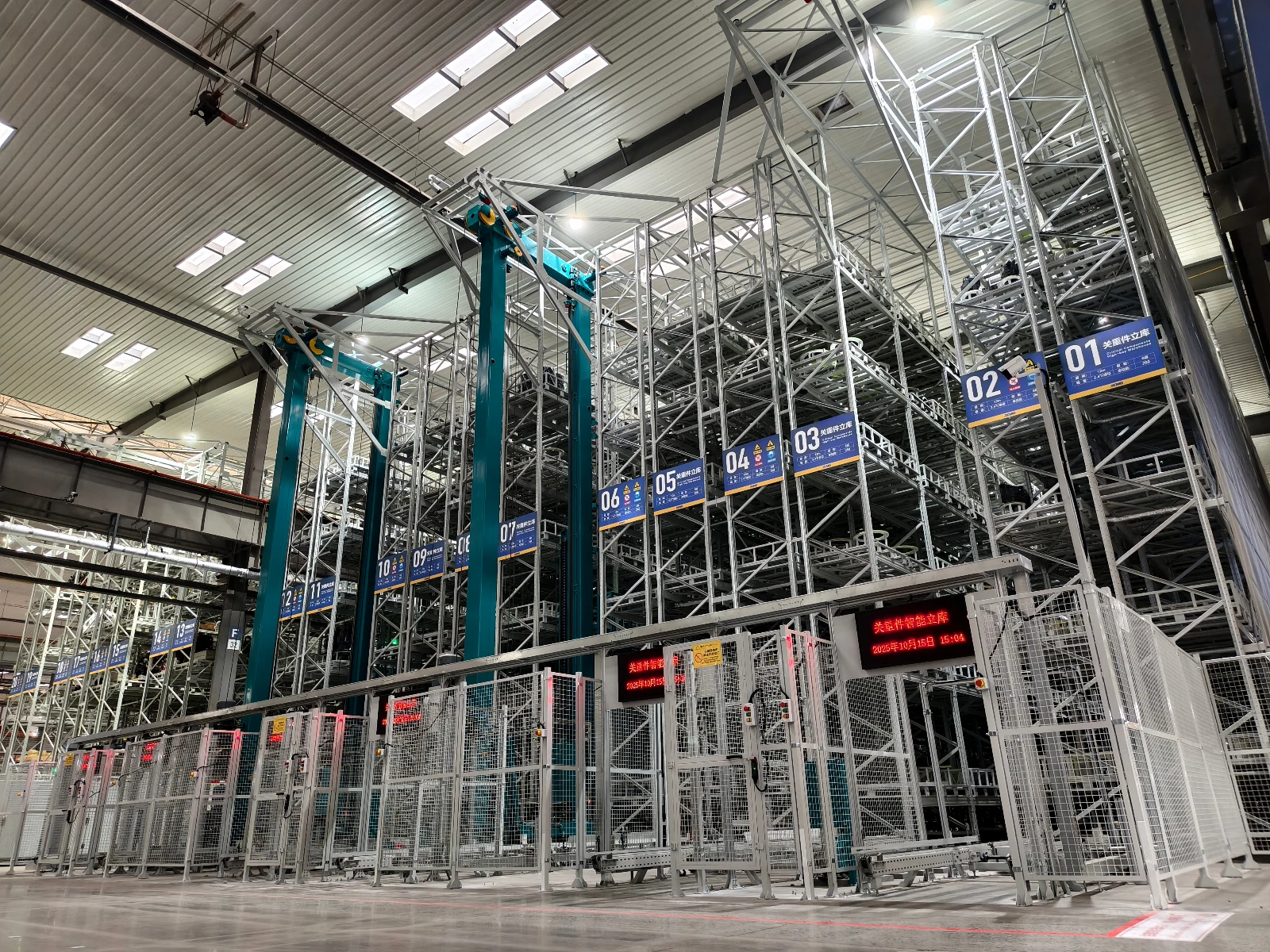 定制化托盘立库系统:设计两种规格立体货架(共4616个货位)和12种托盘,以适配不同规格、尺寸配件的存储,搭载5台双伸位单工位堆垛机实现立体货架的高密度存取,定位精度≤±5mm。